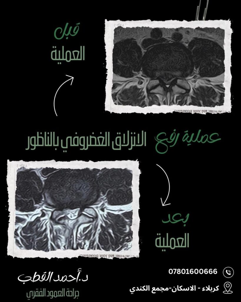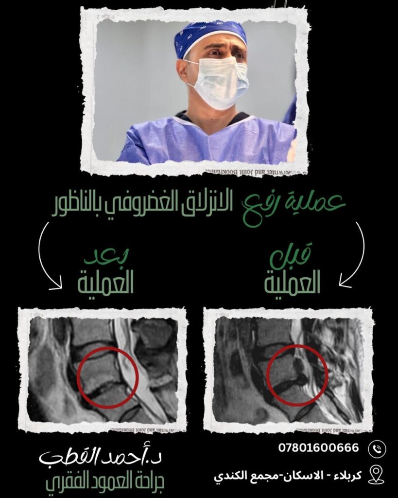 بعد إجراء الفحوصات وصور الرنين المغناطيسي، تبين وجود انزلاق غضروفي منبثق مع تضيق في القناة العصبية بين الفقرتين القطنيتين الرابعة والخامسة . وبناءً عليه، أُجريت له عملية دقيقة ومتطورة بالناظور شملت: