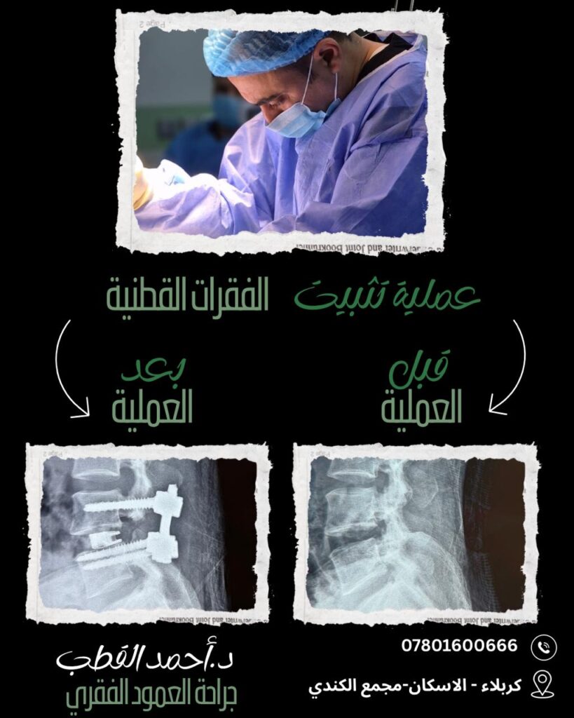 تم إجراء عملية دقيقة لتثبيت الفقرات وتحرير الأعصاب، حيث تظهر صور الأشعة المرفقة النجاح في زراعة البراغي الطبية والقفص الغضروفي بدقة متناهية، مما أعاد الاستقامة المثالية للعمود الفقري، وفتح المساحات المتضيقة للأعصاب، ووفر الثبات اللازم لمنع أي احتكاك مستقبلي.